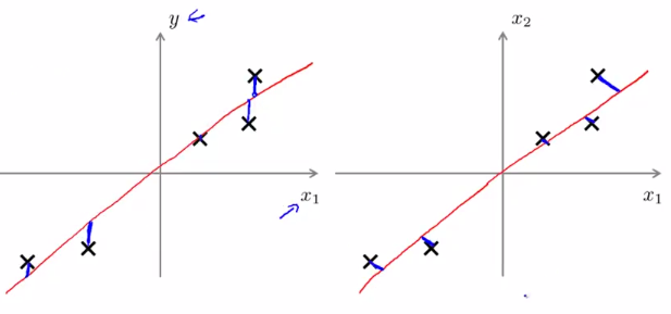 这个例子是把二维的数据降低到一维,它所做的事情就是:找到一条直线(图中红色的直线,也就是向量z),使得各个样本点到这条直线的垂直距离(上图蓝色线段的长度,也被称为投影误差)之和最小。这个乍一看有点像线性回归啊,但两者还是有很大差别的,线性回归求得是y-x的值,而这里是向量的投影误差。再者说,两者所表达的数学含义是完全不一样的,一个是特征数据之间的运算,而另一个则是预测值与真实值之间的运算。具体差别如下图所示,一目了然(左边是线性回归,右边是PCA):