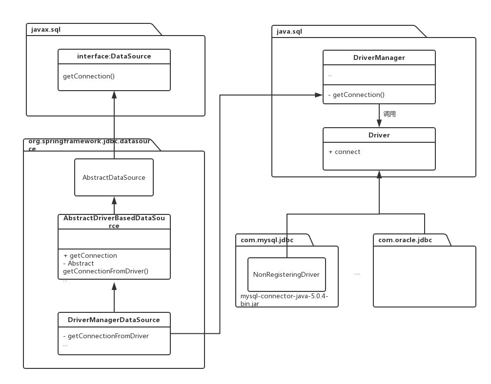 public class DriverManagerDataSource extends AbstractDriverBasedDataSource{ //........... protected Connection getConnectionFromDriverManager(String url, Properties props) throws SQLException { return DriverManager.getConnection(url, props); } //........... } |