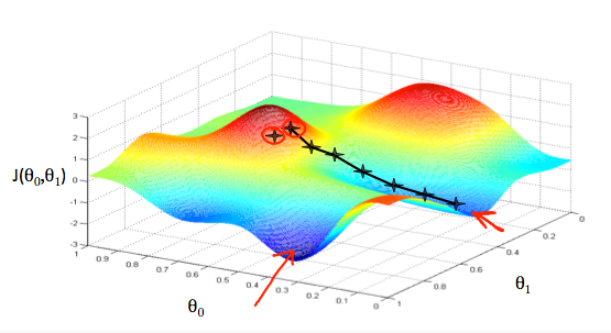 其中,\(\frac{\partial }{\partial \theta_{j}}J(\theta_{0},\theta_{1})\)表示的是对\(\theta_{j}\)的偏导数,\(\alpha\)表示的是下降的步长,也称为learning rate。这里的\(\alpha\)值要控制好,如果太大则不会收敛;如果太小则收敛太慢。