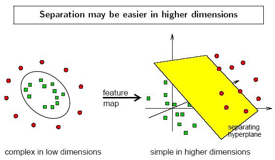 上图左边表示,样本点在二维平面是不能被线性分隔的,但是一旦把它映射到三维空间就可以很容易被一个超平面线性分隔了。(至于为什么会这样,如何证明我就orz了…)具体地,