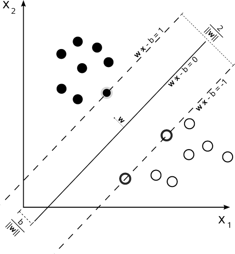 $$min\left \{ margin*\frac{1}{2}*\left \| w \right \| ^{2}\right \}, \\ s.t. \\ y_{i} (w^{T}x + b) >= margin$$